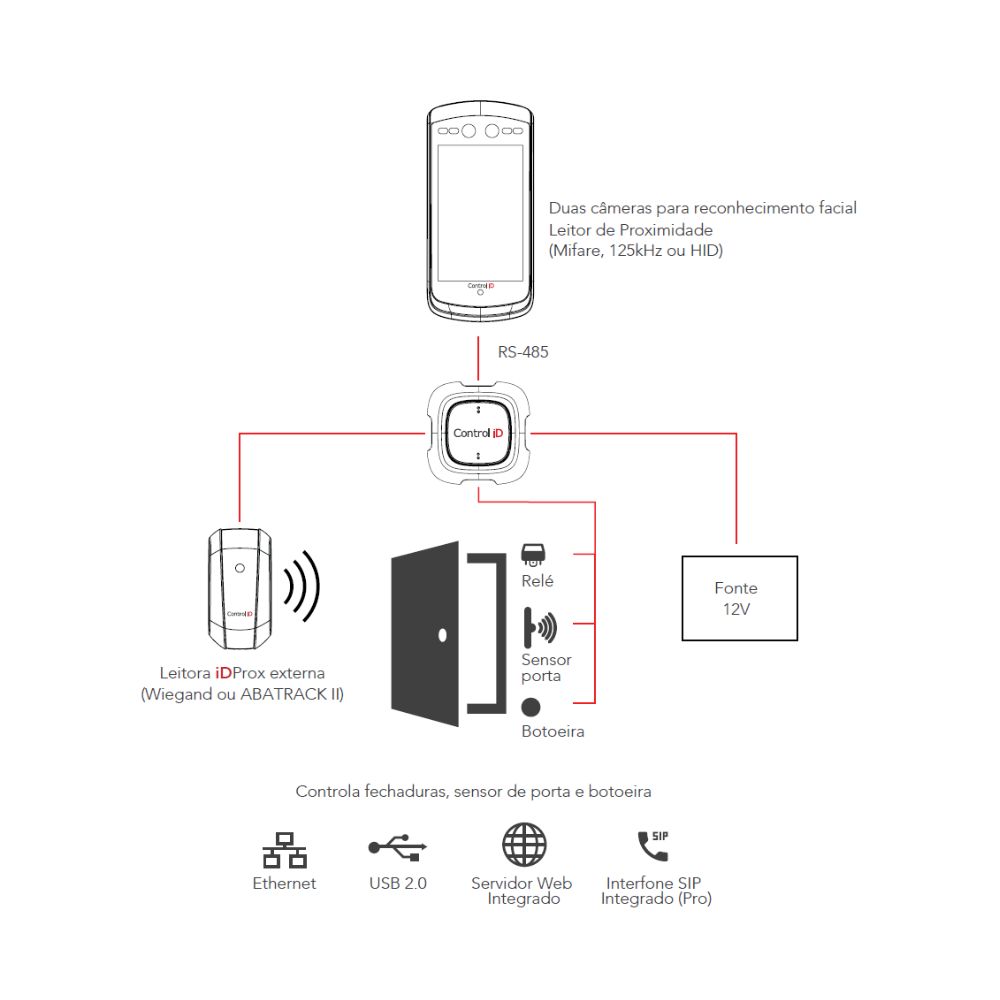 Controle de portas: através do módulo de acionamento externo e/ou relé interno
